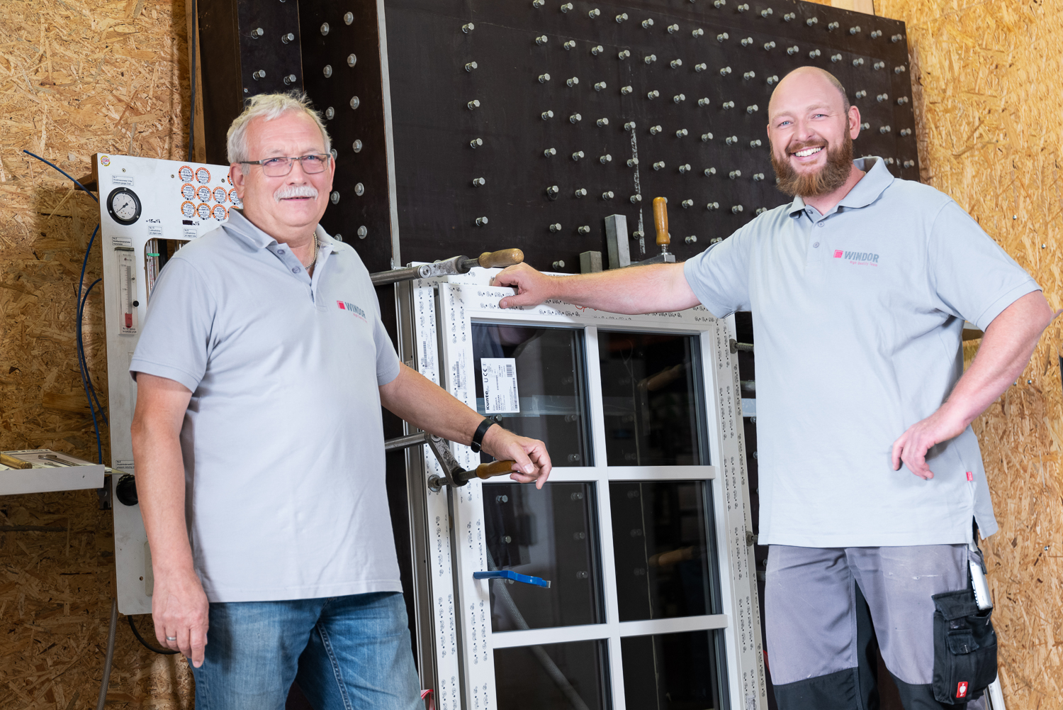 Bild: Mit dem RAL-Gütezeichen wird die Qualität von Fenstern auf Herz und Nieren geprüft, hier am Prüfstand der Firma WINDOR durch die Sachverständigen Robert Speiser (r.) und Lothar Röhreich (l.). Bildquelle: WINDOR.