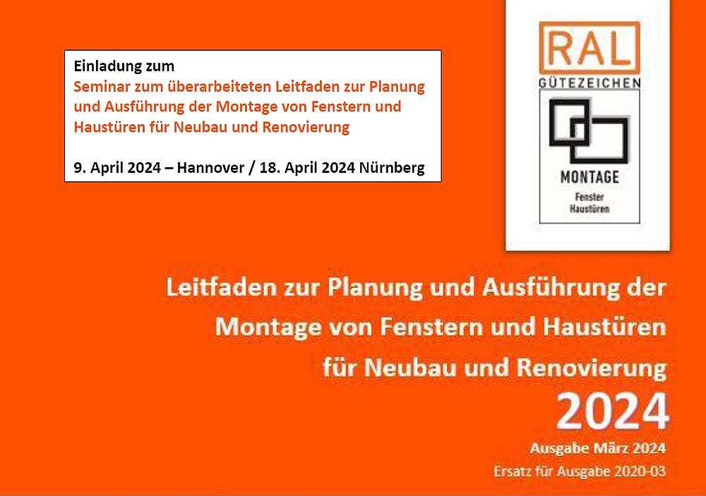 Frankfurt am Main, 22. Februar 2024. Am 9. April 2024 in Hannover und am 18. April 2024 in Nürnberg finden OnTour-Seminare der Gütegemeinschaft Fenster, Fassaden und Haustüren zum neuen Leitfaden zur Mon-tage von Fenstern und Haustüren statt. „Mit diesen beiden Angeboten jeweils von 9.00 bis 16.30 Uhr sprechen wir Interessenten aus Nord- und Süddeutschland an“, meint Ulrike Döbel, Leiterin der Geschäftsstelle der Gütegemeinschaft. „Auf dem Programm stehen die Grundlagen und die wichtigsten Neuerungen des Leitfadens von 2024.“
