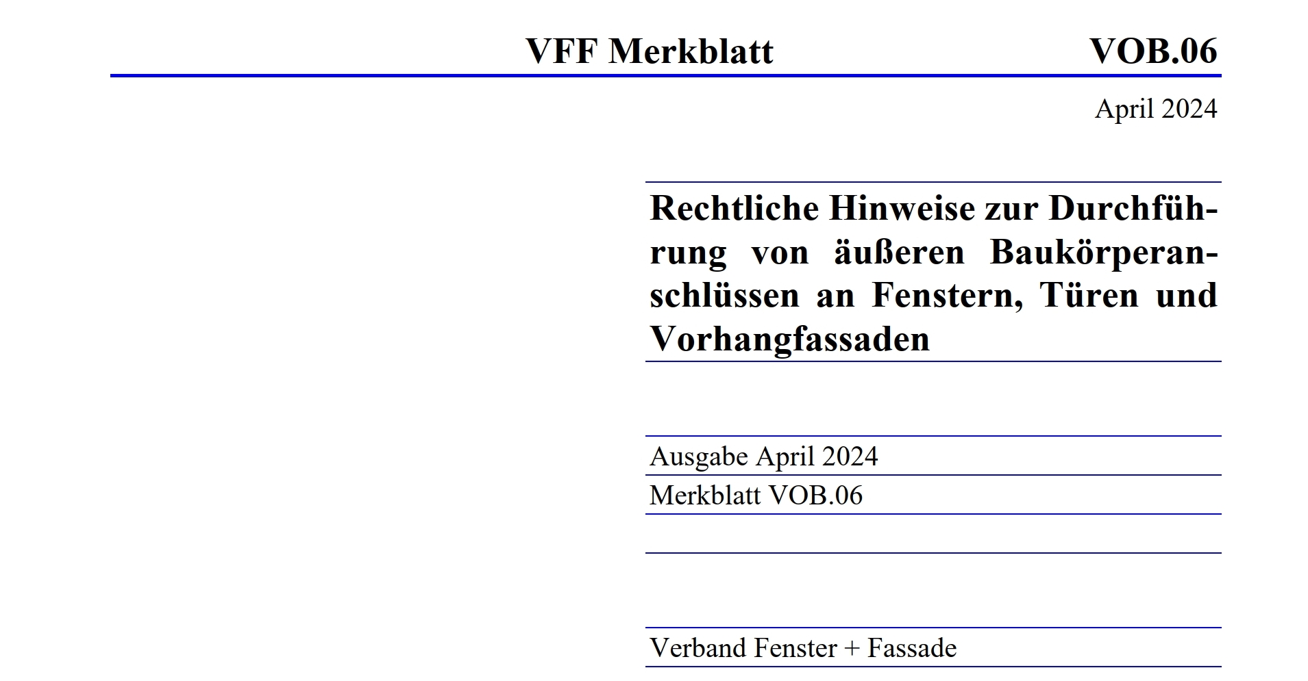 Das Merkblatt VOB.06 „Rechtliche Hinweise zur Durchführung von äußeren Baukörperanschlüssen an Fenstern, Türen und Vorhangfassaden“ umfasst 28 Seiten und wurde in einer VFF Ad-Hoc-Gruppe in Zusammenarbeit mit Vertretern der Gütegemeinschaft Fenster, Fassaden und Haustüren e.V., dem Institut für Fenstertechnik (ift), von Unabhängige Berater für Fassadentechnik e.V. (UBF) und dem Bundesverband Tischler Schreiner Deutschland erarbeitet.