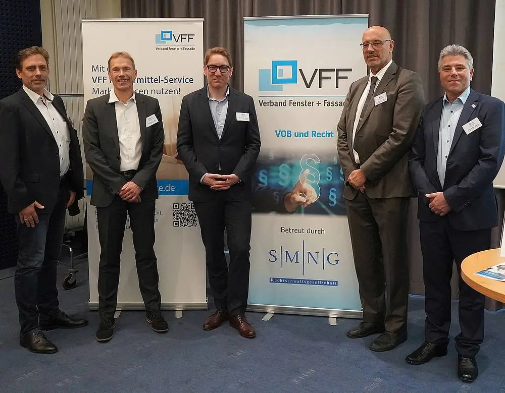Foto „FT_VOB2023-10_Referenten“: Die Referenten der Fachtagung VOB und Recht am 24. Oktober 2023: (von links) Dr. Christian Brinsa, Dr. Frank Kumlehn, Dr. Tobias Rodemann, Prof. Christian Niemöller und Markus Christoffel (Foto: VFF)